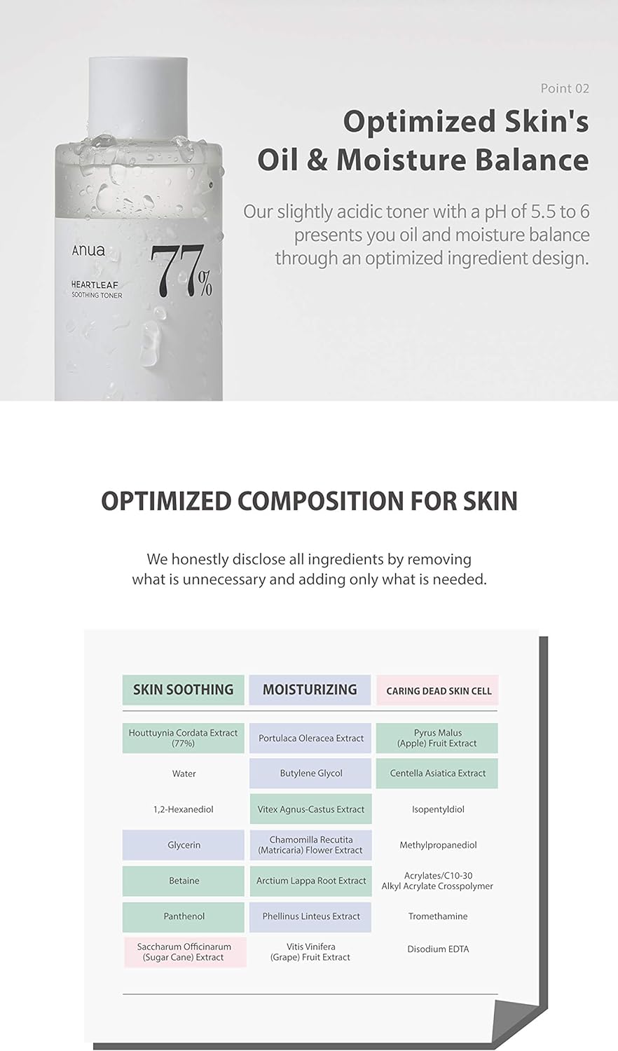 • Anua Heartleaf Soothing Toner  Is an Excellent Skin Trouble Care This is the toner that contains houttuynia cordata extract to the highest level, which is good for skin trouble care. Heartleaf is very effective for calming skin troubles.