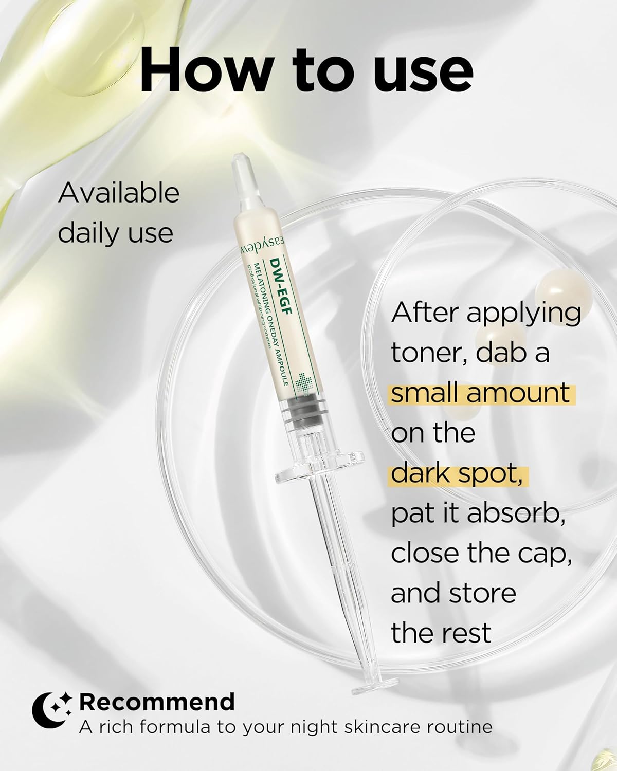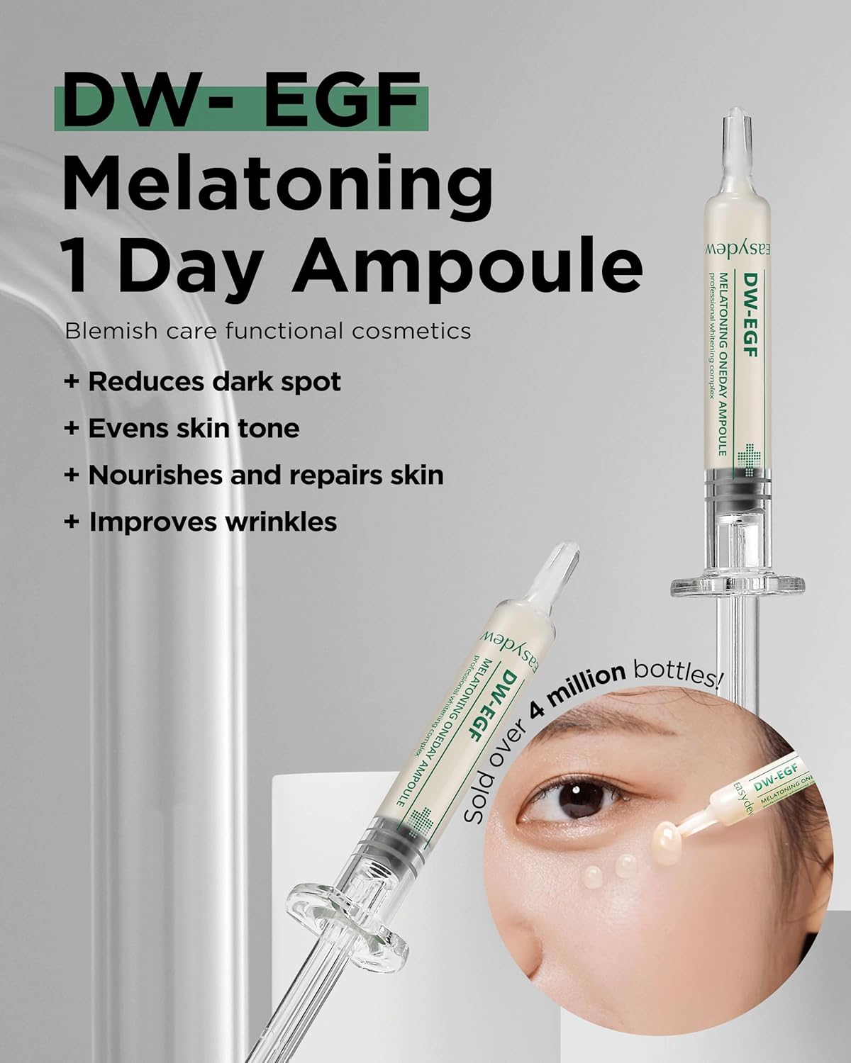 Transform your skin with the DW-EGF Melatoning Oneday Ampoule. This powerful formula functions as a dark spot remover and discoloration corrector by reducing excess melanin production. Regular use over two weeks or more is recommended for achieving a more uniform and radiant complexion, effectively targeting freckles and uneven skin tones.